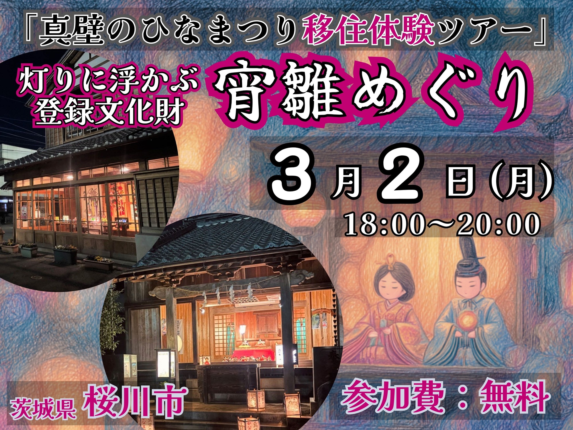 現在『真壁のひなまつり和の風第二十一章』が、 2月4日(火)~3月3日(月)迄開催中です。 3月2日(日)に開催される宵雛を、移住コンシェルジュとともに巡ってみませんか? 宵雛とは? 真壁のひなまつりの期間中に催されるイベントの一つです。 昼間は店舗や地域住民のみなさんが来場者をおもてなししている為、各お雛様を見ることができないことから、一日限りで有志が夜もお雛様を展示し、お雛様に参加している全員に楽しんでもらおうというイベントです。 移住コンシェルジュや地域住民の方と一緒に、夜の真壁の町並みを歩いてみませんか? 昼間では味わえない特別な雰囲気のおひなさまに出会える機会となっています。