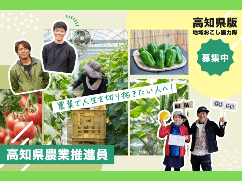 【ひとことで言うとこんな仕事】 高知県版地域おこし協力隊として、ビジネス感覚に優れた農業法人のもとで栽培技術や経営ノウハウを習得していただくとともに、県内における農業の担い手確保に向けた取り組みをサポートしていただくミッションです。将来的には、自らが農業法人の経営者として独立・就農することを目指していただきます。 【ミッション】 ◆具体的な仕事内容 ①独立自営就農及び法人化に向けた知識や技術の取得 ②高知県の農業担い手の確保に向けた活動サポート ◆任期終了後の道 任期終了後は、まずは農家としての独立(独立自営就農)を目指し、その後10年後を目処に農業法人の設立を目指していただきたいと考えています。就農や法人設立に向けては、サポートチーム(県、市町村、受け入れ法人、農業経営・就農支援センターなど)が伴走支援しますので、ご安心ください。 ◆他の農業ミッションとここが違う! ①農業法人の経営者を目指すミッション ②インターンでおためしできる ③法人立ち上げのためのサポートチームがある ◆高知県で農業に挑戦するメリット ①「日常使いされる野菜」の生産が日本一! ②独立就農や法人設立を目指す人への支援が充実! 【こんな方におすすめ】 ・“稼ぐ農業”に挑戦したい方 ・法人に弟子入りして、段階的に独立を目指したい方 ・栽培だけでなく、農業経営やマーケティングにも関心がある方 ・将来的に、生産者というより「経営者」になりたい方 ・全国屈指の”園芸王国”で農業をしたい方 全国トップレベルの農産物生産量を誇る高知県で、がっつり稼げる農業を実現していただくためのミッションです! ご応募、お待ちしております✨