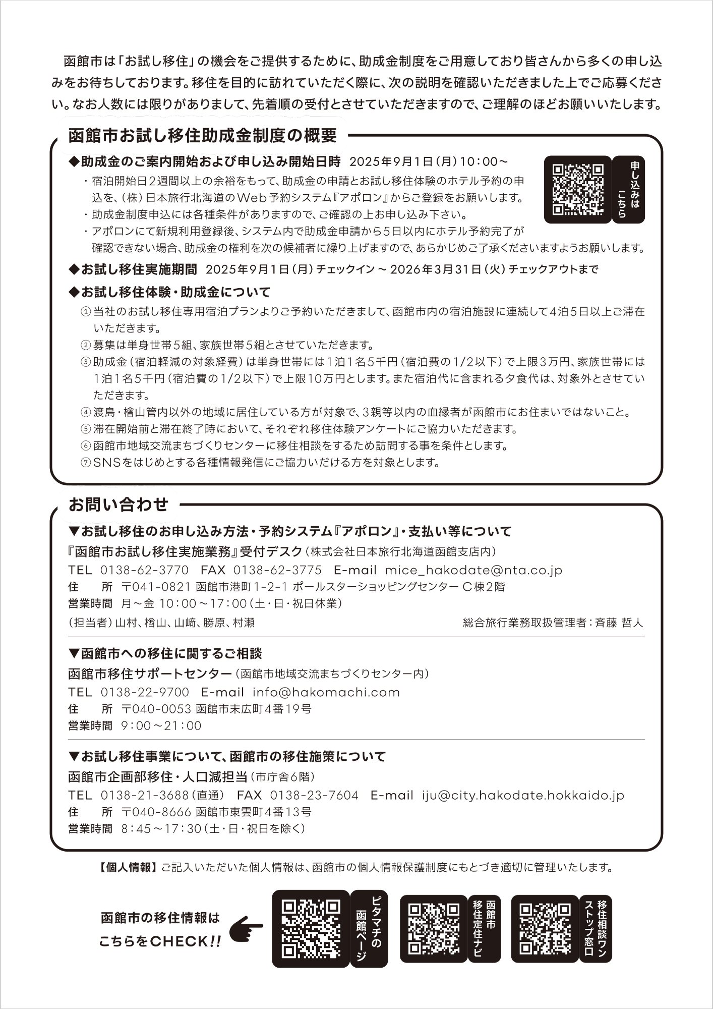 函館市は「お試し移住」の機会をご提供するために、助成金制度をご用意しております。 移住を目的に函館市を訪れていただく際に、応募詳細を確認の上でお申込みください。 9月1日(月)より、申込を開始いたしました。 お試し移住体験の期限は、2026年3月31日(火)ホテルチェックアウトまでとなっております。 ご参加の条件は、下記制度の概要をご参照ください。 https://va.apollon.nta.co.jp/hakodate_ijuu2025/files/250830.pdf 人数には限りがあるため、先着順の受付となっておりますので、お早めにチェックしてみてください! その他、ご不明な点がありましたら、各お問い合わせ先までご連絡いただきますようお願いいたします。
