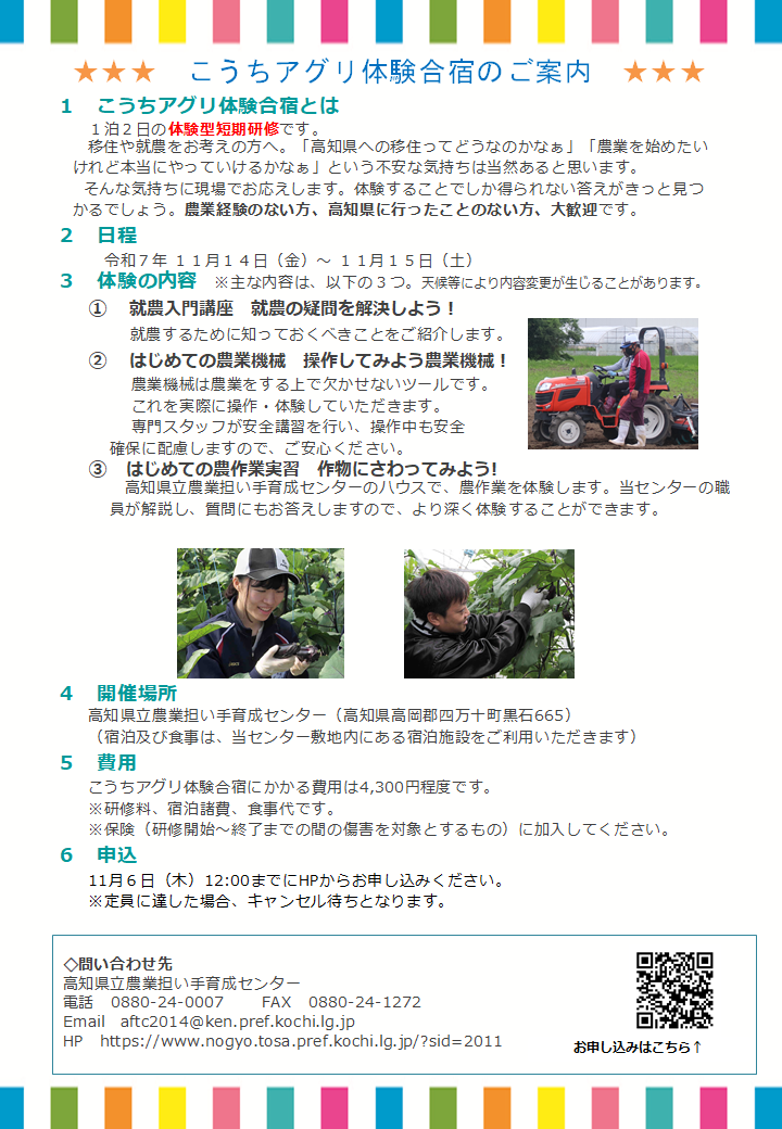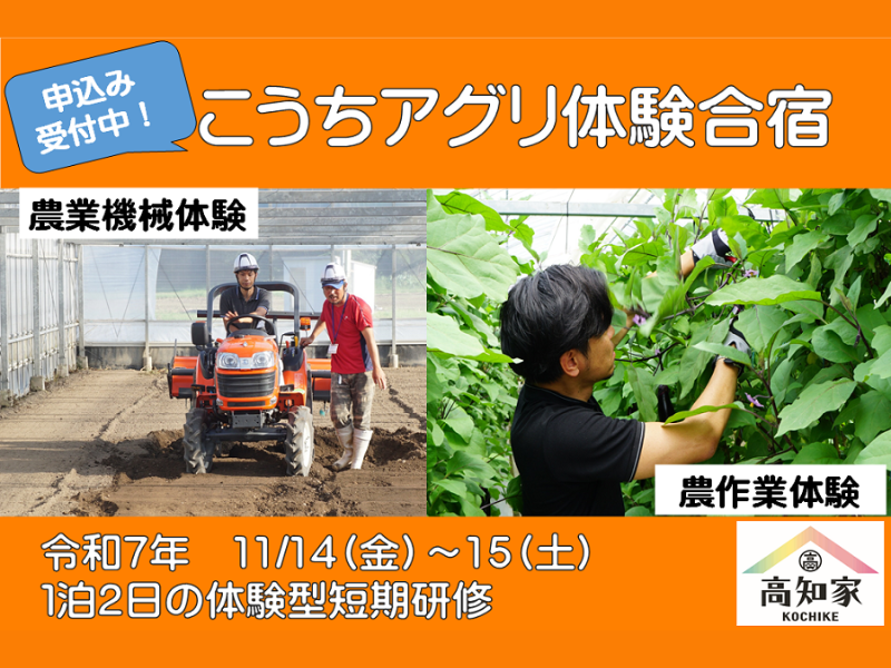 ◇日程 令和7年11月14日(金)10:00~11月15日(土)15:20 ◇開催場所 高知県立農業担い手育成センター (高知県高岡郡四万十町黒石665) ※食事、宿泊は当センター敷地内施設を利用します ◇プログラム(予定) 1日目 10:00~ 開講式、オリエンテーション 10:30~ 就農入門講座: 就農するために知っておくべきことをご紹介します。また、よくある質問にもお答えします。 11:00~ 農作業体験:当センターのハウスで収穫等の農作業が体験できます。 担当職員が品目ごとの特性や作業について丁寧にレクチャーします。1日目はキュウリ、ナス、ピーマン、シシトウのうち、いずれか1 品目の作業をハウス内で体験します。 12:00~ 昼休み 13:00~ 農作業安全講習 14:00~ 農業機械操作体験&個別就農相談:トラクターや管理機の操作を専門の職員が丁寧に指導します。就農相談では就農に関する疑問や悩みなど、お気軽にご相談下さい。 2日目 8:30~ 農作業体験:1日目に体験していない残り3品目の作業をハウス内で体験します。 12:00~ 昼休み 13:15~ 場内案内 14:30~ 着替え・片付け・アンケート記入 15:00~ 閉講式:閉講式後、寮の見学を希望者の方には、ご案内します。 ◇費用 4,300円程度(研修料、宿泊諸費、食事代など) ※傷害保険(研修開始~終了までの間の傷害を対象とするもの)に加入して下さい。 写しの提出はいただきませんが、緊急時に連絡先が分かるようにご準備下さい。 ◇交通費助成 高知県外居住の方には、こうちアグリ体験合宿の参加前に、当センターが配信する動 画「どこでも学べる農業入門講座(無料)」を視聴し、理解度アンケートにお答えいただ いたら交通費の助成(条件付)があります。詳細についてはお問い合わせください。 ◇土佐市産地ツアー(希望者のみ、開催日:合宿翌日の令和7年11月16日(日)) こうちアグリ体験合宿の翌日に高知県土佐市で産地訪問ツアーが開催されます。 高知県最大のピーマン産地の土佐市で、実際にピーマンを栽培する農家さんのハウスと 集出荷場を見学することができます。 参加希望の方は、体験合宿申込後に農業担い手育成センターが送る事前アンケートから お申し込みください。