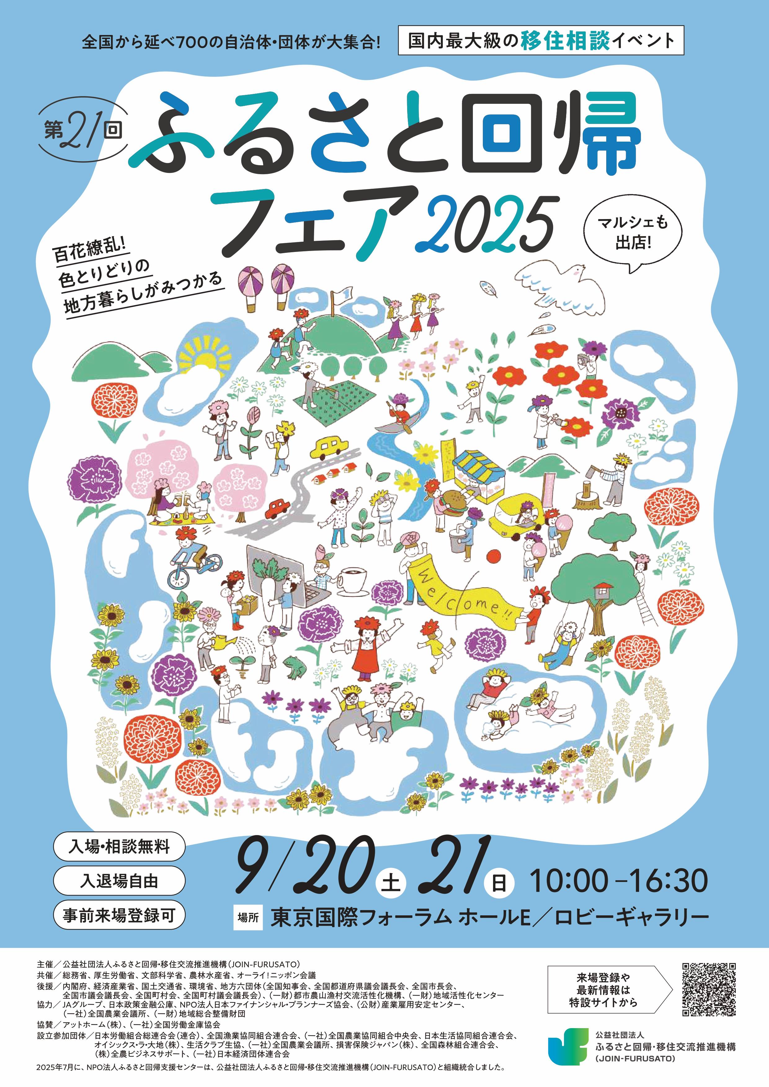 全国から自治体・団体が大集合しますので、希望地域を絞れていない方、移住を考え始めた方にはぴったりのイベントです! 丸森町からは、全国50の地域を見て比べて丸森町に移住したスタッフも参加します。 「移住って何から始めればいい?」「移住して本当に良かった?」など、どんなことでもご相談ください。 事前に来場登録をしていただくと入場がスムーズです。 たくさんの方とお会いできることを楽しみにしています!