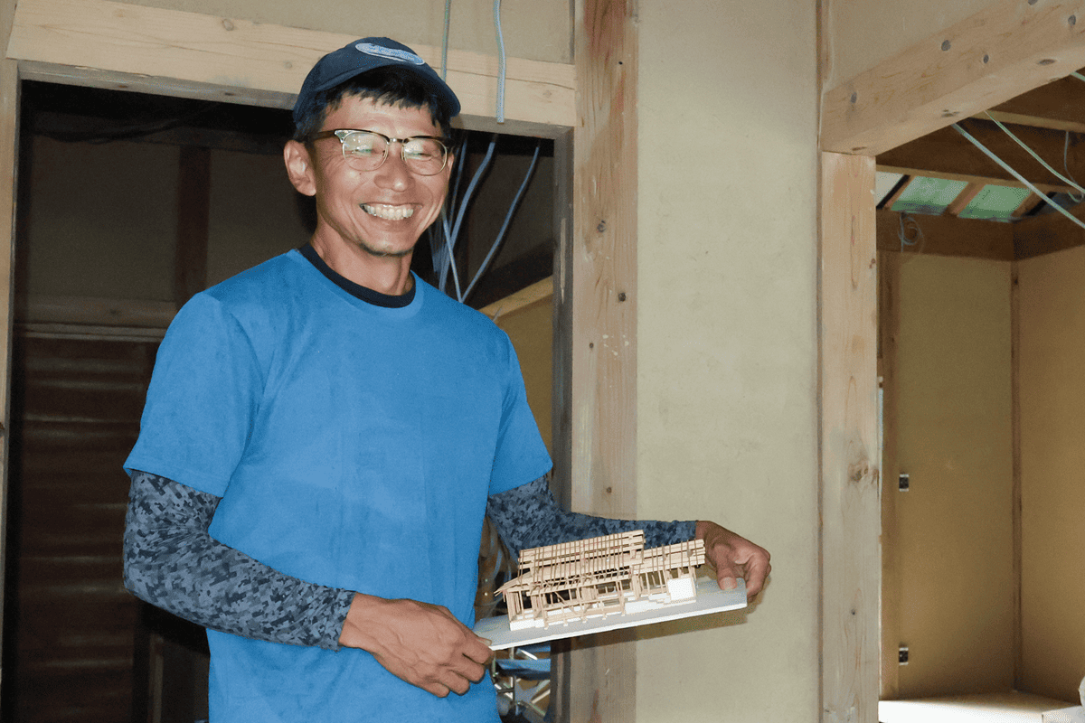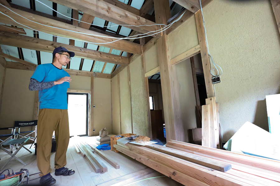 高知県本山町。豊かな山に囲まれた場所で、「自分の手で家を建てる」という壮大なプロジェクトに挑む一人の男性がいる。川端俊雄さん、52歳。自身が切りだした木、家の周りにある土と藁、安く譲ってもらった瓦。あるもので家を建てる、ずっとやってみたかった挑戦に共感してくれた仲間たちも加わり、単なる「家づくり」を超えた一つの物語がここに生まれようとしている。 川端 俊雄さん 出身地:大阪府 現住所:本山町 移住年:2013年 職業:林業家 「林業をやっているから、毎日木を切り出しているわけですよね。柱とか、家の材料になる。あ、これを使って自分で家を建てたら面白いやろうな、と」。林業の世界に飛び込むため、13年前に大阪から高知県本山町へ移住。山で木と向き合う日々の中で抱いた素朴な思いが、この壮大な挑戦の始まりだった。 家づくりをスタートするにあたり、まず頭に思い浮かんだのは年の離れた妻や子どもたちのこと。彼らに引き継いでいく家をつくる。そう考えると「ゆくゆく修繕ばかり必要な、自己満足の家になったらいかん。永く安心して暮らせるしっかりした家を作らないと」。素人には難しい「設計」と「基礎」は専門家に依頼することに決めた。 ■理念が引き寄せた出会い、5年間寄り添う「伴走者」 「セルフビルドで家を建てたい」。一見すると途方もない挑戦に思えるが、手を差し伸べてくれる人がいた。「土佐派の家ネットワークス」の設計士、松澤敏明さんだ。 「土佐派の家ネットワークス」とは、「高知の木材、土佐漆喰、土佐和紙等の伝統的な素材を使い、高知の風土に根差した家づくり」を理念とする設計士と素材生産者、工務店、職人の集団である。川端さんが「自ら本山町の木を切り出し、そこにある土を使って家族の家をセルフビルドしたい」と語った時、松澤さんはその姿に「土佐派の家」が掲げる理念の原点を見た。 「いつのまにか伝統的な家は手間がかかり過ぎ高くなり、庶民のものではなくなってしまった。昔は建前に集落のみんなが助けて建てていた。建築を自分たちの手に取り戻す、彼の挑戦は面白い。」 松澤さんは、単に設計図を描くだけの存在ではなかった。コンセプトの共有から始まり、時に教育的な指導をしながら、瓦・照明など、面白がって協力してくれる土佐派の家の業者さんを紹介し、関係者との調整役まで買って出る。5年もの間、プロジェクトに寄り添い続ける「伴走者」として、川端さんを支え続けている。 ■途方に暮れた日を救った、地域の温かい繋がり 家づくりは、まず材料の確保から始まった。川端さん夫婦は自ら山に入り木を切り出したが、いざ製材してみると想定していた量の半分にも満たなかった。 「四角い柱を取るのに、どれだけ無駄が出るのか。認識不足でしたね。」 途方に暮れた川端さんを救ったのは、地域の人々との繋がりだった。移住当初からお世話になっていた地元工務店の社長が快く力を貸してくださり、何とか木材を確保。また、その縁から地元の製材所にも声がかかり、協力の輪が広がっていく。素人には難関であった資材発注量の計算方法-木拾い(きびろい)から木材の刻み方に至るまで、プロの技術を惜しみなく教えてもらい、何とか家づくりの入り口までこぎつけた。 「お世話になっていることだらけで、全部自分たちでというわけではないんですよ。」と川端さんは笑う。 ■資金難が生んだ奇跡、「セルフビルド」から「コミュニティビルド」へ 家づくりを進める中、次はウッドショックによる資材高騰が川端さんを襲う。資金不足という壁に直面し、苦肉の策としてクラウドファンディングに挑戦した。 「リターンは、この家を建てる作業を手伝える権利」。 にわかには信じがたいかもしれないが、このユニークな返礼と無謀とも思えるプロジェクトを「面白い!」と共感してくれる人々がいた。彼らは東京から神戸から、「お金を払ってでもやってみたい」とわざわざやってきてくれた。もちろん面識はない。支援してくれている知人たちも交え、皆で和気あいあいと家づくりの作業を行った。 かつては、集落で家を建てると聞けば皆で手伝った。「そういうのをコミュニティビルドと言うらしいんですけど、結果的にその形ができたなって。」地域にとどまらず、初対面の人も各地から助けに来てくれる。期せずして現代版コミュニティビルドが出来上がった瞬間だった。 その象徴が、リビングの土壁だという。プロの左官屋が塗った壁、川端さん自身が塗った壁、友人が塗った壁、そして、左官屋の6歳の息子が仕上げた壁。それぞれの壁は表情が異なり、一枚一枚が唯一無二の「味」となっている。そこには、この家づくりに関わった人々の確かな息遣いと、温かい思いが刻まれている。