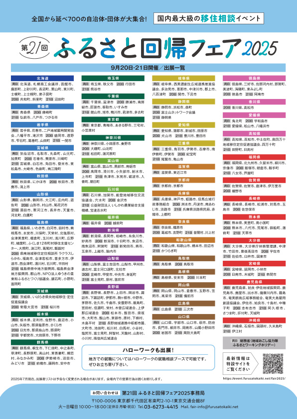 こんにちは! 🍇笛吹市が「ふるさと回帰フェア2025」に出展します! 山梨県笛吹市は、2025年9月20日・21日に東京国際フォーラムで開催される「第21回ふるさと回帰フェア2025」に出展します! ※笛吹市の出展は21日のみです。 全国から約700の自治体・団体が集まる国内最大級の移住相談イベントで、笛吹市の魅力をたっぷりご紹介します。 🍑 自然と都市のバランスが絶妙なまち、笛吹市 四季折々の美しい風景、豊かな温泉、果物王国ならではの農の恵み。 子育て・教育・医療などの生活環境も充実しており、移住先としても注目されています。 👨👩👧👦 移住・定住に関するご相談も大歓迎! 当日は市の担当者が直接対応し、住まいや仕事、子育て支援など、気になることを丁寧にご説明します。 📍 イベント詳細 日時:2025年9月20日(土)・21日(日)10:00〜16:30 ※笛吹市の出展は21日のみです。 会場:東京国際フォーラム ホールE/ロビーギャラリー 入場・相談無料、入退場自由 🌐 詳しくは ふるさと回帰フェア2025特設サイト をご覧ください。
