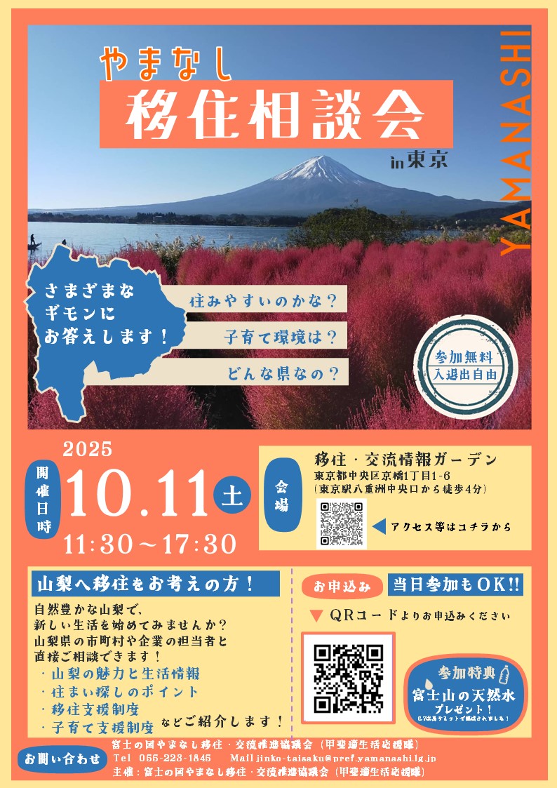 こんにちは! 山梨県笛吹市が都内で10月に開催されるやまなし移住相談会に出展します! 県内の自治体が集まる移住相談会で、笛吹市の魅力をご説明いたします。 ぜひこの機会にご参加ください! ●暮らしにちょうど良いまち、笛吹市 四季折々の風景、豊かな温泉、桃・ぶどう日本一ならではの農の恵み。 子育て・教育・医療などの生活環境も充実しており、移住先として注目されています。 ●些細なご相談も大歓迎 当日は市の担当者が直接対応し、住まいや仕事、子育て支援など、気になることを丁寧にご説明します。