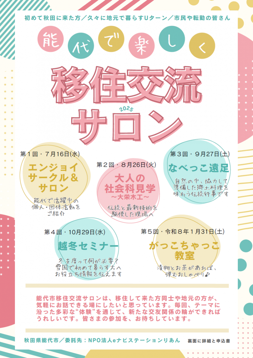 能代へ移住された方、移住したい方、応援したい地元の方が、気軽におしゃべりしながら情報交換を楽しみ、交流を深めるサロンです。各回定員がありますので、事前にお申込みが必要です。申込書は関連ファイルからダウンロードできます。