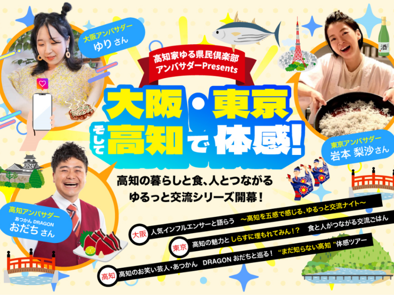 高知を愛するアンバサダー3名がプロデュースする 大阪・東京・高知のリアルイベントをご紹介✨ ゆる県民倶楽部*アンバサダーだからこそプロデュースできる特別なイベントです✨ 最近高知に興味を持ち始めた方、ディープな高知ファン、 「高知」をキーワードに新しい仲間と出会いたい方など ぜひお気軽にご参加ください♩ ※ゆる県民倶楽部とは? 「高知のことをもっと知りたい」「高知ともっとつながりたい」 という方むけの「ゆる~い」Instagramです。 Instagramをフォローすれば、あなたも高知家のゆる~い家族、いわゆる「ゆる県民」です!! ~大阪イベント~ 大阪アンバサダーゆりさんpresents 人気インフルエンサーと語らう ~高知を五感で感じる、ゆるっと交流ナイト~ 京都出身で現在は高知在住のインフルエンサーとして活動している 「yuri」さんを囲んで、高知の暮らしや魅力などご自身の エピソードを交えながらお話が聞けるトーク&交流イベントです。 \高知を感じるおもてなしが盛りだくさん/ ★高知のドリンクで皆さまをお出迎え ★特産品が当たるクイズ大会 ★高知のお土産を皆さまにプレゼント お食事を楽しみながらみんなで交流しましょう ✨ 【イベント概要】 【日時】 2025年10月24日(金) 18:30~21:30 【会場】 ゆったりソファ&個室 ロジック 梅田店 大阪府大阪市北区堂山町3-13あじびる北別館5F 【会費】 3,000円(税込) お料理11品+3時間飲み放題! ※キャンセルは10月21日までに事務局へご連絡ください。10月22日以降はキャンセル料が発生します。