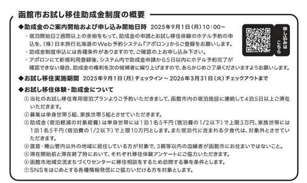 9月より募集開始いたしました「函館市お試し移住」。 10月14日現在で多くのお問い合わせをいただいております。 家族世帯は予定定数に達したため受付を終了しております。 単身世帯は残り3枠ございます。 随時、情報更新してまいります。 お早目のご登録をお願いいたします。 体験期間は2026年3月31日(月)チェックアウトまで。