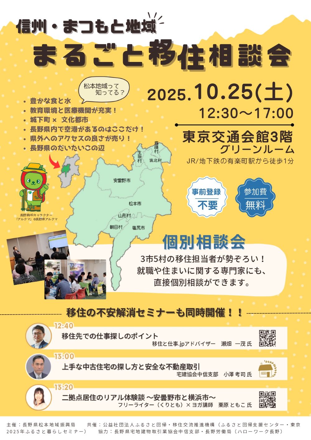 松本地域の8市村(松本市・安曇野市・塩尻市・筑北村・麻績村・生坂村・山形村・朝日村)が一堂に集まる年の一度の大相談会を開催します。 移住相談、就職相談、住まいの相談、農ある暮らしの相談のほか、先輩移住者にも相談でき、松本地域のことをまるごと知ることができる絶好の機会です。 ぜひご参加ください!! \松本地域はこんなところ/ 🍎豊かな⾷と⽔ 🍏教育環境と医療機関が充実! 🍎城下町×⽂化都市 🍏⻑野県内で空港があるのはここだけ! 🍎県外へのアクセスの良さが売り! ーーーーー 信州・まつもと地域 まるごと移住相談会 ーーーーー ■開催日: 2025年10月25日(土) 12:30~17:00 ■開催場所: 東京交通会館3階グリーンルーム (東京・有楽町) ■参加費:無料! 事前登録不要!! 【参加自治体】 松本市・安曇野市・塩尻市・筑北村・麻績村・生坂村・山形村・朝日村 ▶詳細はこちらから https://www.furusato-web.jp/event-info/p234645/