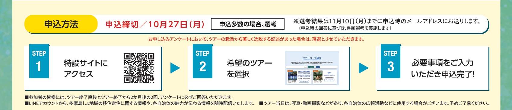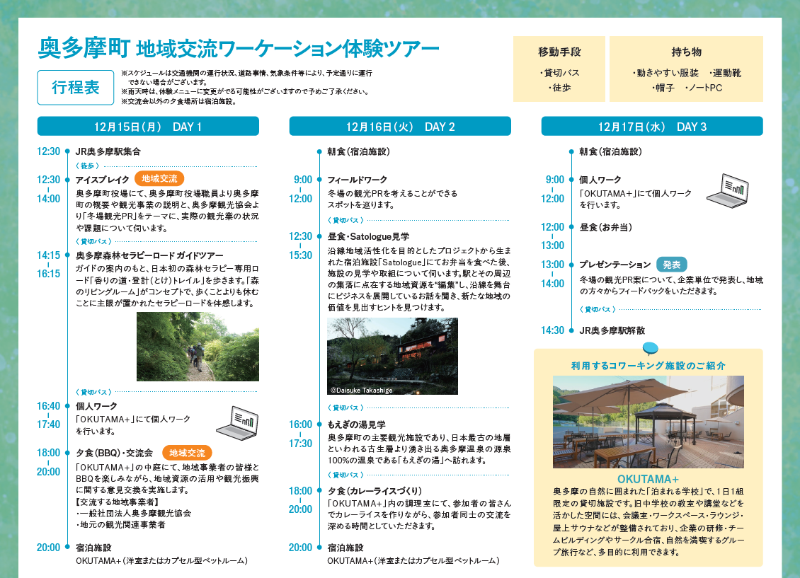 奥多摩町は多摩川の源流域に位置し、豊かな自然と渓谷美が魅力のエリアです。 旧中学校をリノベーションした施設「OKUTAMA+」では、非日常の体験ができます。 日常から離れた刺激がヒラメキや新しい発見をもたらしてくれる。 そんな場所でワーケーションを体験してみませんか? ▶奥多摩町の詳細情報はこちらから https://pitamachi.com/municipality/detail/356 ーーーーーーーーーーーーーーーーーー★★ 奥多摩町地域交流ワーケーション体験ツアー ーーーーーーーーーーーーーーーーーーーー ■開催日 12月15日(月)~12月17日(水) 2泊3日 ■旅行代金:無料! ※集合、解散場所までの往復交通費、個人的な買い物や飲食は各自負担となります。 ■募集定員:企業など3社 計15名 (最少催行人数:1社3名) ■集合・解散場所:JR奥多摩駅 ■申込〆切:10月27日(月) ■申込方法 ①特設サイトにアクセス https://tokyo-tamashima-iju-fair-tour.metro.tokyo.lg.jp/workcation/ ②希望のツアーを選択 ③必要事項をご入力いただき、申込み完了! →選考結果は11月10日(月)までに、申込時のメールアドレスにお送りします。