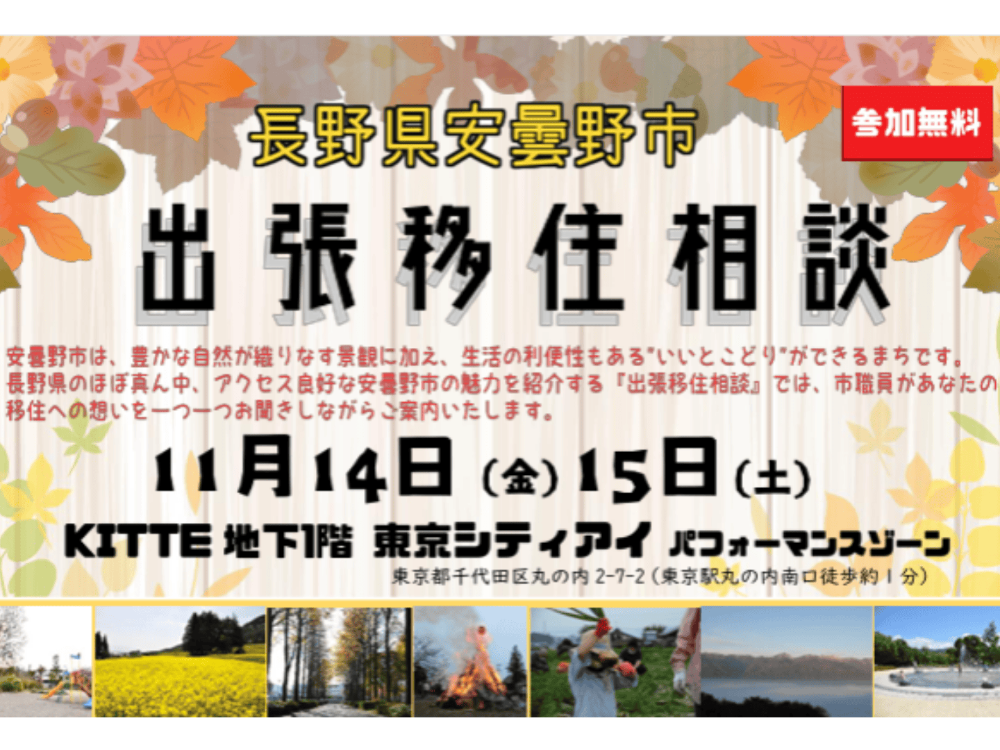 安曇野市では、令和7年11月14日〜15日に、東京駅丸の内南口徒歩約1分にあるKITTE 地下1階パフォーマンスゾーンにて『出張移住相談デスク』を開設します。当日は、同会場にて「信州安曇野ぐらしPR展」を開催。柔道家であづみの移住大使の篠原信一さんのトークショーをはじめ、安曇野が誇るりんごやそばなどの特産品の販売、ワークショップなども行います。このKITTE会場にて、移住相談ブースを設け、市役所職員が長野県のほぼ真ん中でアクセス良好、自然景観に恵まれた安曇野市をたっぷりとご紹介します。