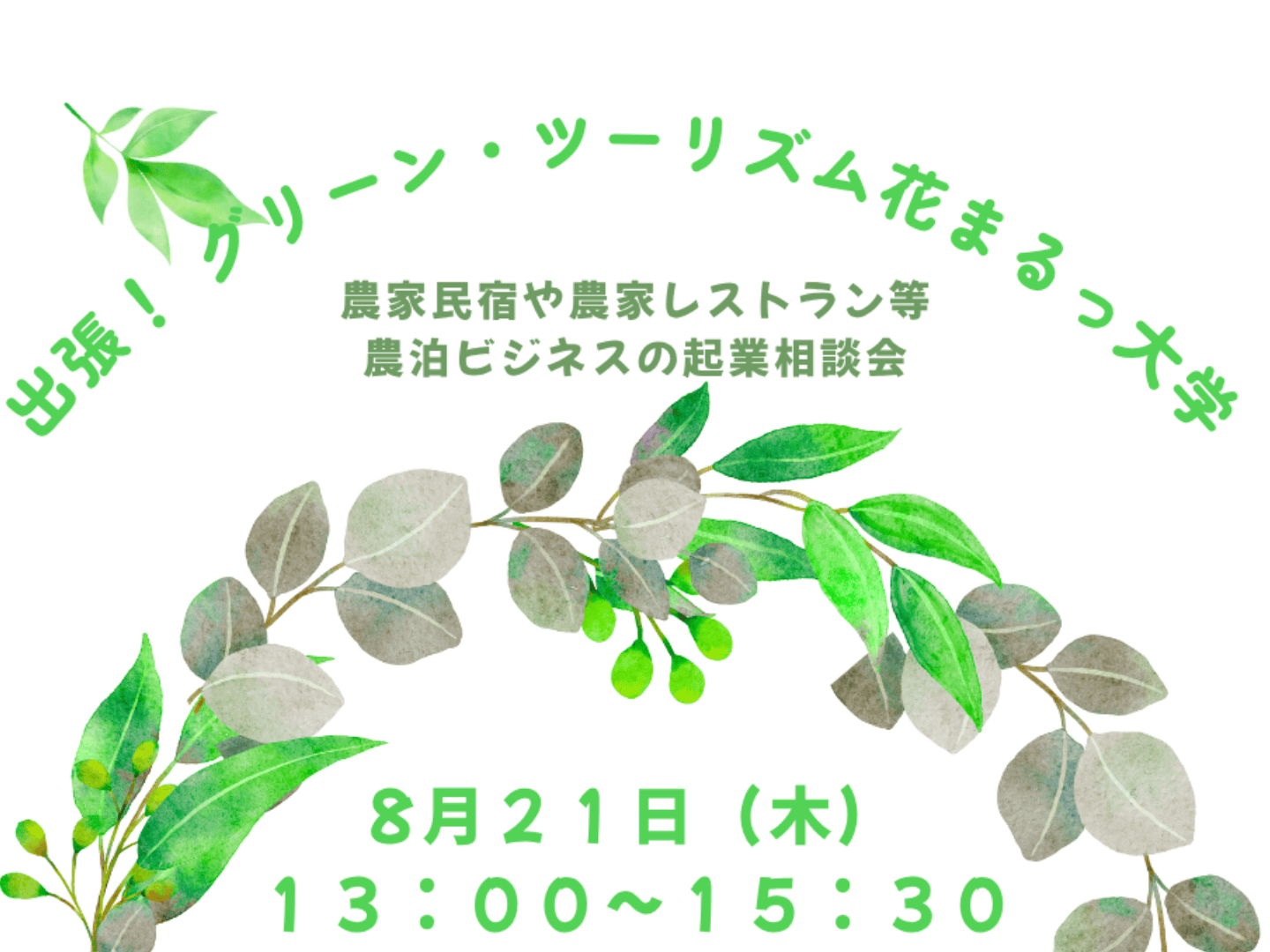 グリーン・ツーリズムに関する相談会(出張!グリーン・ツーリズム花まるっ大学)を開催します。 今年度は、より気軽に参加し、農泊をはじめとするグリーン・ツーリズムのご質問にお答えする相談会形式で、県内を巡回します。県内各地で全6回開催し、そのうち4回は実際に運営している現地を会場に現地見学会も合わせて実施します。 農泊ビジネスに関すること、事業承継に関すること、許認可取得に関すること等を相談内容としており、事前予約の人数がまとまれば、講義形式で実施することも可能です。 グリーン・ツーリズムに取り組んでみたい方からのご相談はもちろん、既に開業している方も気軽に足を運んで頂き、近況とともに運営上の課題等話し合う場になればと思っています。