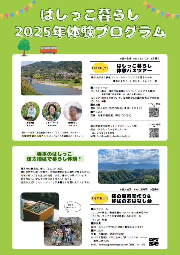 「橋本市が気になるけど、実際に暮らしてみるとどうなんだろう?」 そんな方にむけて、橋本市の暮らしをしっかり体験できる大人気のバスツアーを開催します! まちも、いなかも、ぐるっと一周。移住コンシェルジュがご案内します! 先輩移住者さんに気になることを聞ける座談会もあります。ご自身でお越しいただくだけではわからないことも知れるかも?! あなたも「はしっこ暮らし」体験してみませんか? ご応募お待ちしております♪ ■スケジュール 10:00~ 集合(橋本市保健福祉センター) まち案内、産直市場で新鮮野菜、お土産のお買い物も♪ 12:30~ 地元食材を使ったお弁当でランチ (SHINODA BASE にて) 田舎散歩&先輩移住者さんとの座談会 15:30 解散(市役所) ■参加費 無料(※お弁当代900円は個人負担となります) ■申し込み 申し込みフォーム:https://logoform.jp/form/dD8K/1193475 定員:先着15名程度(10月30日(木)締切) ■注意事項 チャイルドシート・ジュニアシートなど法律上の着用義務がある場合は、SHINODA BASEからのご参加となります。(※要事前相談) <2024年開催の様子を動画でご覧になれます!> https://www.youtube.com/watch?v=twUMsV5Xc6E&t=3s