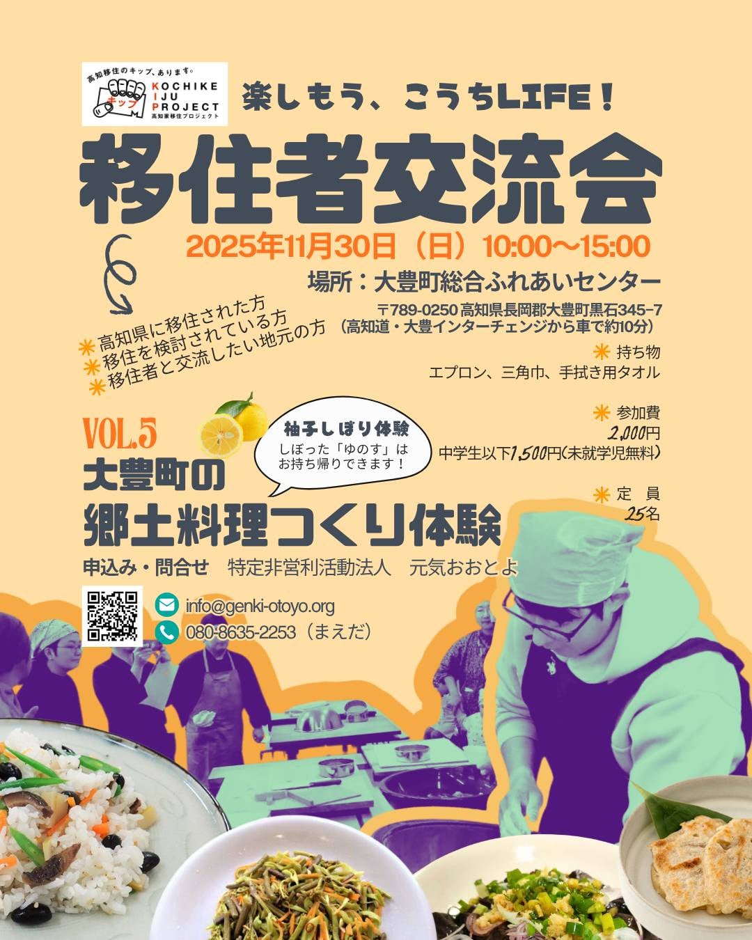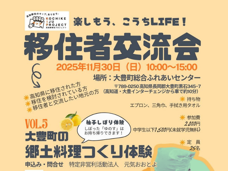 高知の中部エリア 大豊町で 「大豊町の郷土料理づくり体験」を楽しむ 高知家 移住者交流会を開催します!! 大豊町の特産・銀不老を使ったお寿司など、 地域で昔から作られてきた郷土料理づくりをしながら交流を深めましょうΨ(*'ч'*) このイベントは、移住者の皆様に様々な表情を持つ高知の魅力を知ってもらい、交流していただくために開催されるものです。 移住者はもちろん、移住希望者も大歓迎! 高知県在住の方で移住者と接点のある方や接点を持ちたい方、地域の方もぜひご参加ください! ◆イベント内容 【日 時】11月30日(日)10:00~15:00 【内 容】大豊町の特産を活かした郷土料理づくり体験 (銀不老ずし、こんちん、山菜のスタミナ漬け など) 【持ち物】エプロン、三角巾、手拭き用タオル 【会 場】大豊町総合ふれあいセンター(大豊町黒石345-7) 【定 員】25名 【参加費】2,000円 ※中学生以下 1,500円 ※未就学児無料 お申込み、お待ちしております!