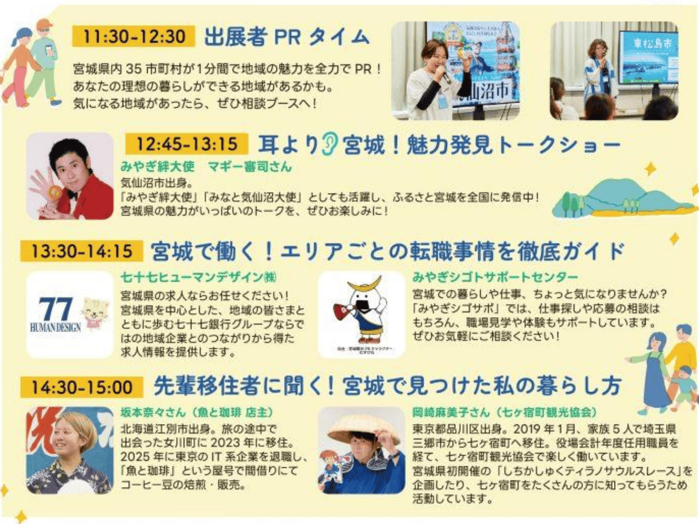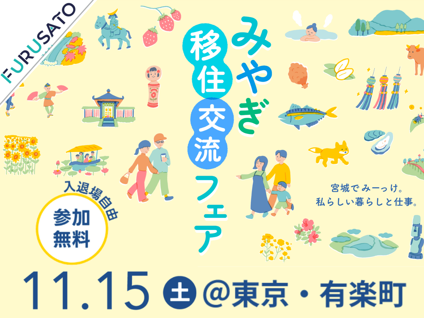東京に、宮城県内全35市町村と移住に積極的な企業が大集合! 楽しめるコンテンツが盛りだくさんのUIJターン向け相談会を開催します! 移住先としての具体的なご相談はもちろん、就職や農業、不動産などのご相談、 移住や宮城に興味はあるけど、まだ漠然としている方への情報提供なども可能です。 相談会だけでなく、セミナー・ワークショップもありますので、みなさまぜひお気軽にご参加ください! ーーー みやぎ移住・交流フェア2025 ーーー ■開催日: 11月15日(土)11:00~16:00 ■会場: 東京交通会館12F ダイヤモンドホール (東京都千代田区有楽町2-10-1) ■参加費:無料! 来場予定の方は事前予約をしていただくとスムーズに入場できます! https://app.spot-recorder.jp/556707_miyagi_iju251115/ ▶詳細はこちら https://miyagi-ijuguide.pref.miyagi.jp/pref-events/42725