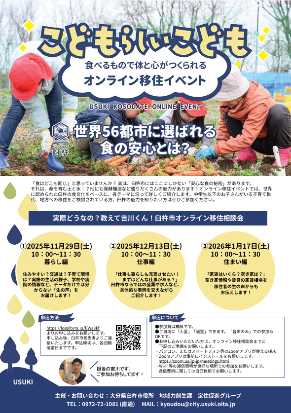 「ユネスコ創造都市ネットワーク(食文化分野)」に加盟された臼杵市が、世界で認められた食文化をはじめ、 学校給食や有機農業、教育環境や住環境など臼杵市の魅力を余すことなくご紹介するオンライン移住イベントを行います。 先輩移住者や臼杵市の移住定住担当の職員が臼杵市のリアルな生活や魅力についても合わせてご紹介します! 全国各地から臼杵での暮らしをイメージできるイベントとなっておりますので、 臼杵市へ関心がある方はオンライン開催ですので、ぜひお気軽にご参加ください! ☆★↓お申し込みはこちらから↓★☆ https://logoform.jp/f/Wa3kf ★☆↓詳細はこちらをご確認ください↓☆★ https://www.city.usuki.oita.jp/article/2025102900018/ ※参加費は無料です ※申し込み締め切りは各回開催日の前日までとなっております。 ※お申し込み後、臼杵市担当者よりご連絡いたします。