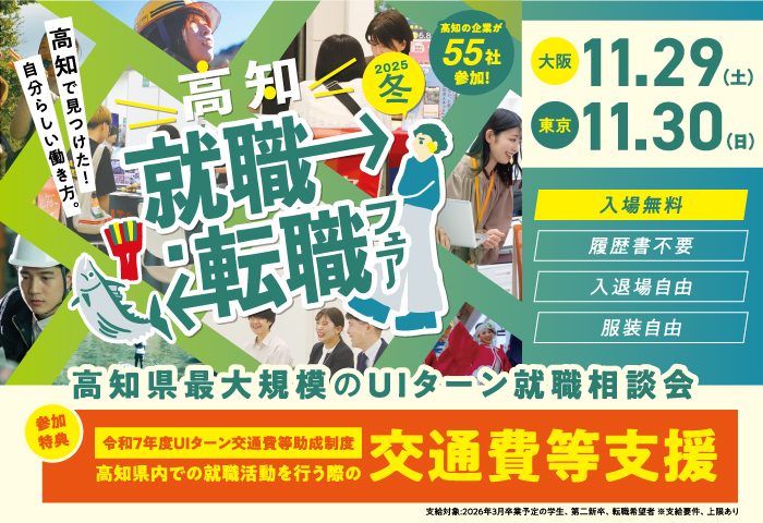 事前予約特典&参加特典有!優良企業が約50社参加する、 高知県最大規模のU・Iターン就職相談会を今年も開催します! 東京・大阪で【高知就職・転職フェア2025冬】を開催!! 2025年11月29日(土)、30日(日)大阪・東京会場にて、【高知就職・転職フェア2025 冬】を開催いたします。 【たった1日で様々な高知県の企業に出会えるチャンス!】 U・Iターンを考えている方、地元就職を目指す学生、キャリアチェンジを検討中の社会人まで、どなたでも参加可能。 企業の担当者と直接話せる貴重な機会に加え、UIターン経験者のセミナーやキャリア相談、適性検査、高知の特産ドリンクが楽しめる「高知カフェ」など、充実したコンテンツをご用意しています。 事前予約をするとスカウト特典や書類添削の優先予約も可能。 参加無料・入退場自由! あなたに合った“高知での働き方”を見つけに、ぜひお越しください。 📍【大阪】11/29(土) 難波御堂筋ホール 📍【東京】11/30(日) 東京交通会館 【“高知で働く”をリアルに体感できる1日!】 地元企業やUIターン採用に積極的な企業が多数出展! 現場の担当者と直接話すことで、高知での働き方や企業文化を具体的に知ることができます。 会場ではさまざまなサポート・体験コンテンツをご用意✨ ▶ UIターン先輩セミナー 実際に移住・転職を経験した先輩たちが登壇し、「移住前に不安だったこと」「高知でのリアルな働き方」など、ここでしか聞けないエピソードを紹介。高知暮らしのヒントが見つかります。 ▶ キャリア相談・UIターン相談 「高知に帰るか迷っている」「自分のキャリアを活かせる仕事が知りたい」など、どんな相談も歓迎です。 経験豊富なスタッフが、あなたの状況に合わせて親身にアドバイスします。就職を前提としない相談もOKです。 ▶ 適性検査で“自分らしさ”を発見 自分の強みや働き方のスタイルを分析できる無料の適性検査を実施。自己理解を深めることで、より納得感のある就職・転職活動につながります。 ▶ 高知カフェでほっとひと息 会場内には、高知の特産ドリンクを無料で楽しめるスペースも。気軽に情報収集したり、スタッフに相談したりしながらリラックスできます。 ▶ 事前予約でスカウト・優先特典 事前にエントリーすると、あなたのプロフィールを見た企業からスカウトが届くかも? また、書類添削コーナーや適性検査を優先的に利用できるなどの特典も。 当日の入場もスムーズになり、より充実した時間を過ごせます。 「なんとなく高知に帰りたい」「いずれは移住を考えている」という段階でも大丈夫! フェアで出会う企業や人とのつながりが、あなたの“次の一歩”を後押します
