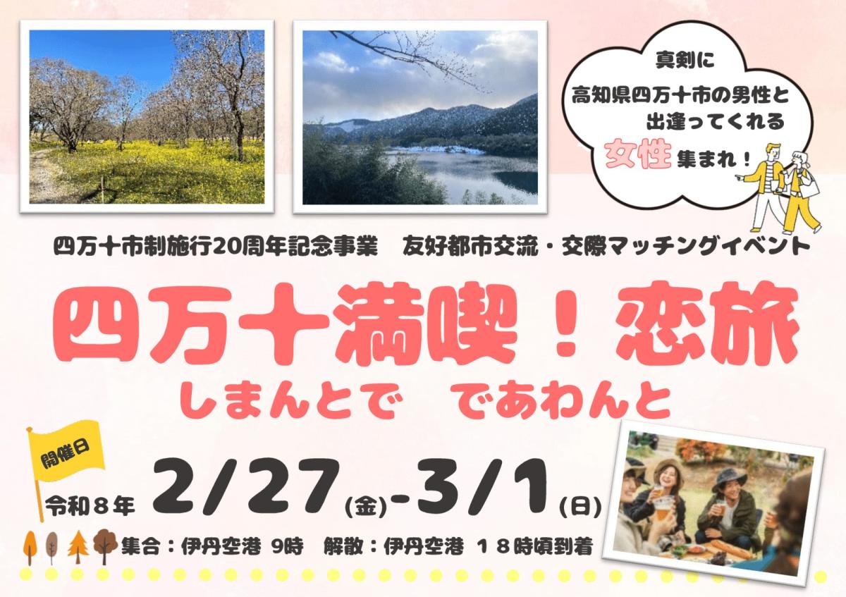 四万十市の自然や食文化を味わいながら、地元の男性と交流しませんか? 四万十市制施行20周年を記念し、友好都市である大阪府枚方市とその周辺市町村(伊丹空港に集合可能ならどこに居住していてもOK)から女性参加者を募り、婚活イベントを開催いたします。 四万十市の魅力たっぷり、男性のおもてなしたっぷり! 気持ちもお腹も満たされること間違いなしの「恋旅」に一緒に出かけませんか? ■ 日程 令和8年2月27日(金)~3月1日(日) 【1日目】 ・集合:伊丹空港 ※集合時間:9時00分(予定) 高知空港到着後、市のバスで四万十市へ移動(途中、四万十町で昼食) ・開会セレモニー ・四万十市内での街歩き(参加男性によるレクチャー・エスコート) ・夕食 交流会(料亭 吾妻) ・宿泊:中村プリンスホテル ※女性のみ 【2日目】 ・入田ヤナギ林での菜の花見学 ・屋形船での四万十川遊覧(船内で昼食) ・下船後、四万十川での写真撮影、歓談 ・BBQ(参加男性によるおもてなし) ・四万十天文台での星空観測 ・宿泊:星羅四万十 【3日目】 ・レザークラフト体験 ・フリータイム ・マッチングイベント ・閉会セレモニー セレモニー後、市のバスで高知空港へ移動 ・解散:伊丹空港 ※解散時間:18時20分(予定) ■ 対象 枚方市または周辺市町村にお住まいの概ね20歳から39歳までの独身女性 ■ 募集人数 20名 ※応募者多数の場合、抽選とさせていただきます。抽選結果につきましては令和7年12月を目途にお申込みいただいた方全員へ電子メールにてお知らせいたします。 ■ 参加費 30,000円(当日支払い) ※上記イベント内容に係る「往復飛行機代」「宿泊代(2泊分)」「食事代」「アクティビティ代」をすべて含んでいます。 ■ 申込締切 令和7年11月30日(日)
