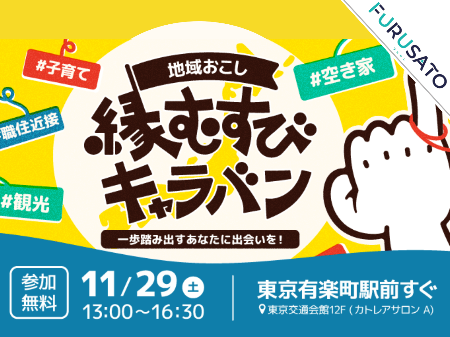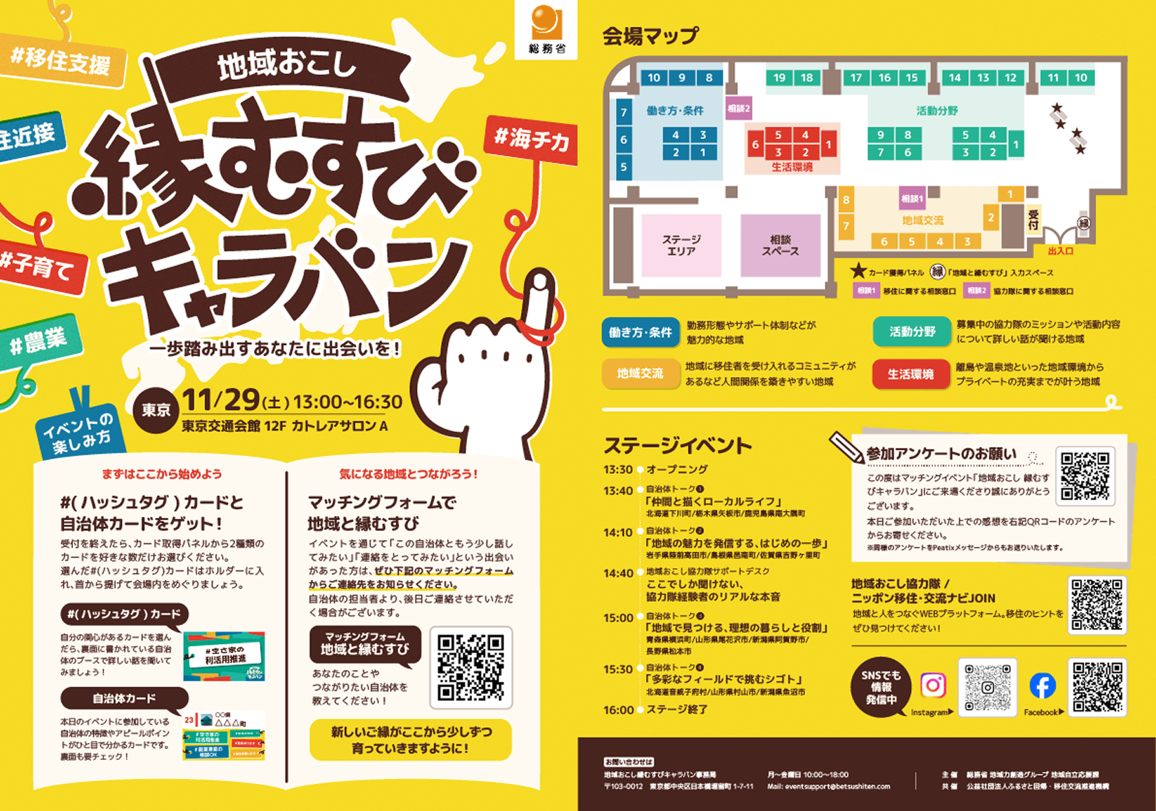 「地域おこし縁むすびキャラバン」は、地域おこし協力隊に関心のある方と、協力隊募集中の自治体がリアルで出会えるマッチングイベントです。 自分自身や地域の特徴を示す「#(ハッシュタグ)カード」を通じて、お互いに共鳴できる相手と出会う、「人」と「地域」のリアルな縁むすびを後押しします。 ーーー 「地域おこし縁むすびキャラバン」 ーーー ■開催日: 2025年11月29日(土) 13:00~16:30 ■会場: 東京交通会館12FカトレアサロンA 東京都千代田区有楽町2-10-1 ■参加費:無料! ■ご来場登録(必須) オンラインでの事前来場登録をお願いしています。 当日は受付で、スマホのQRコードをかざすだけのスマート受付です。 ▶お申込みはこちらから https://chiikiokoshi-enmusubi1129.peatix.com/ ーーーーー