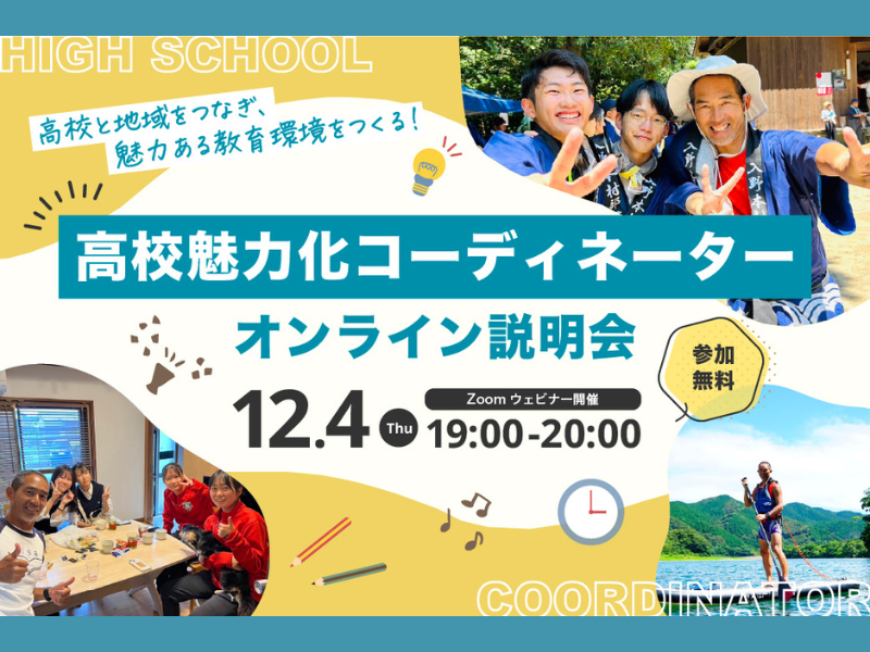 高知県では少子化により高校入学者数が減少し、特に中山間地域の高校存続が課題となっています。 その課題を解決するため、豊かな自然環境や地域資源を活かし、地域と連携を図りながら入学者数の増加と学校の活性化に向けた取り組みを進めています。 また、県外の生徒が高知県の高校に入学し、豊かな自然や地域の人々と関わりながら学ぶ「こうち留学」の取組も行っています。 この「地域との連携」や「こうち留学」の取組をさらに進めるために、高知県高等学校振興課では「高校魅力化コーディネーター(高知県版地域おこし協力隊)」を募集しています。県内では、既に8名のコーディネーター(30代から70代)が活動中です。 今回は「佐川高校」「室戸高校」の2校で新たな仲間を募集! 現役コーディネーターによるリアルなトークセッション付きのオンライン説明会を開催しますので、ぜひお気軽にご参加ください。