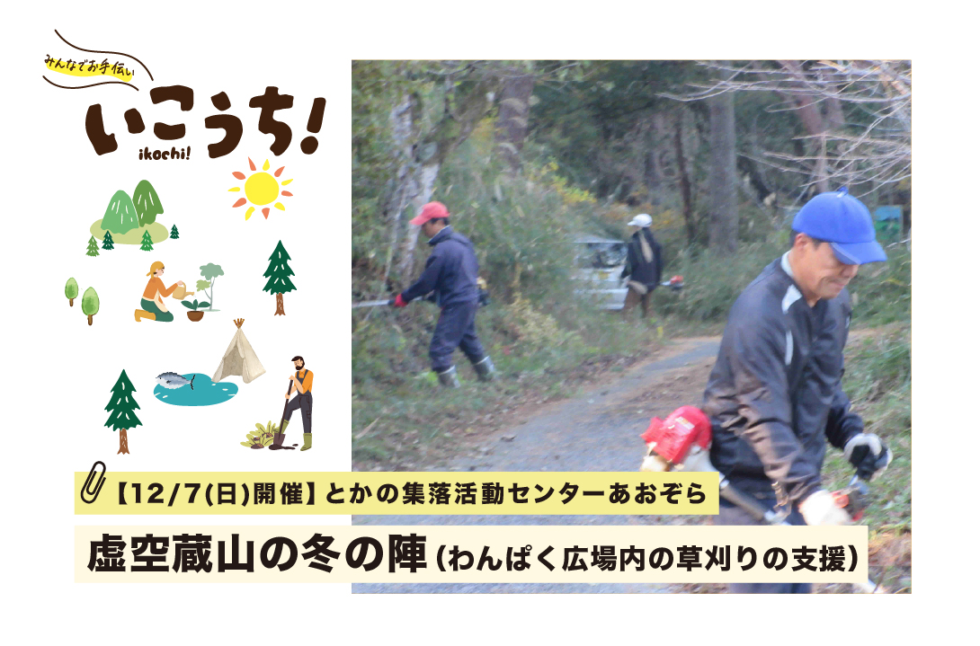 開催日時: 2025年12月7日(日)8:00〜11:30 ※16:00〜慰労懇親会(参加費無料) ※少雨決行、降雪や大雨等の荒天の場合は12月14日(日)に延期 開催エリア:佐川町 主 催 者 : とかの集落活動センターあおぞら(NPO法人とかの元気村) 対 象: 田舎暮らしに興味のある人、地域づくりに興味のある人、 イベントが大好きな人 草刈り作業を体験したい人(10代を除く全世代) 応募締切: 2025年11月30日(日)17:00 高知県 佐川町にある、わんぱく広場内の草刈りをしていただきます。例年20〜30人で行いますが、公園が広いため人手が不足している状況です。本プログラムは夏場も実施していますが、特に冬場は作業範囲が広がるため、夏場以上にサポートが必要になります。 イベントの参加者には、スタッフとしての役目を担いつつ、地域の方との交流や親交をしてもらいたいと思っています。一部の作業は重労働になる可能性もありますが、作業後には慰労会を用意しますので、一緒に頑張りましょう!地元スタッフとの交流を通じて、地域を知っていただき、ファンになってもらえると嬉しいです。