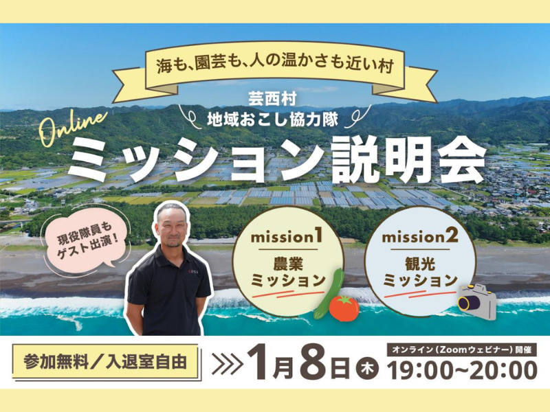 高知県東部に位置する芸西村(げいせいむら)は、県内でもトップクラスの園芸農村として知られる村です。温暖な気候、豊かな自然環境、そして温かい人の距離感が揃っています。 今回は、芸西村で募集している2つの地域おこし協力隊ミッションについて、 村の担当者、現役隊員、Time Link Creation 遠藤が出演するオンライン説明会を開催します。 「村での暮らしってどんな感じ?」 「農業って未経験でも本当にできる?」 「協力隊の任期終了後のキャリアって?」 そんな疑問に、現場をよく知るメンバーが本音でお答えします。 地域おこし協力隊への応募を検討する前に、”芸西村で働くイメージ”をつかみたい方におすすめの説明会です。