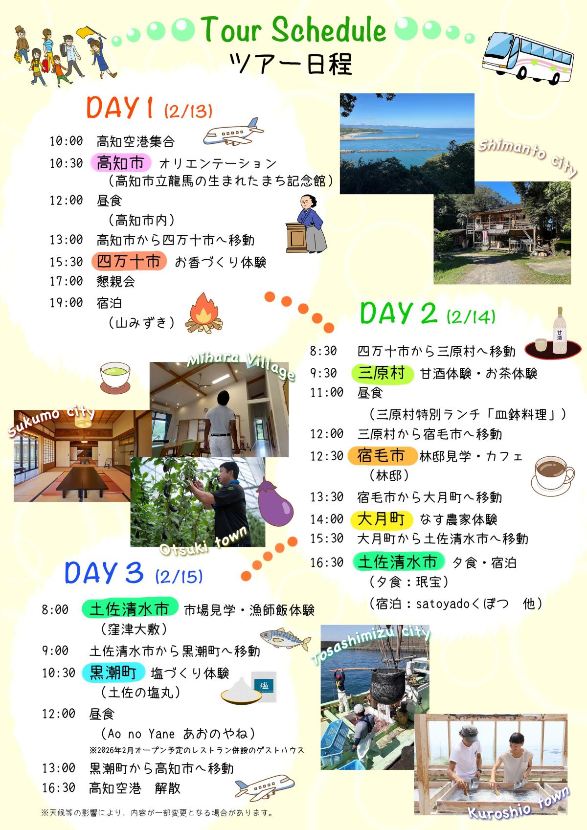 【1日目】 ◆ 四万十市 便利さと自然が両立する“ほどよい田舎暮らし” 生活施設の充実した四万十市では、豊かな自然と快適な暮らしが両立。お香づくり体験のあと、懇親会では先輩移住者の話を聞き、移住後の生活をよりリアルに想像できます。 【2日目】 ◆ 三原村 山に抱かれた“ていねいな暮らし”を体感 田舎の原風景が残る三原村。旬の食材が豊かで、山や畑に寄り添った子育て環境があり、自然豊かな暮らしができるのが魅力です。サイクリングを楽しんだり、ランチでは特製の「皿鉢料理(さわちりょうり)」を堪能。 ◆ 宿毛市 温暖な気候と海のそばの快適さを実感 海も山も川も、そして離島まで揃う宿毛市は、自然の中で思いきり遊べる環境が整っています。便利な生活環境も確保されており、自然と利便性をどちらも大事にしたい方にぴったりです。築130年の「林邸」で歴史ある町並みに触れます。 ◆ 大月町 “柏島ブルー”の海と、ゆるやかな島時間 透明度の高い海が日常のすぐそばに。ダイビングや釣り、シュノーケリングといったマリンアクティビティが日常的に楽しめます。地元農家さんを訪問し、なす農家体験を通して地域の暮らしをのぞけます。 3日目 ◆ 土佐清水市 ダイナミックな自然の中で暮らすという選択 四国の最南端にあり、足摺岬や竜串など壮大な自然景観が広がる土佐清水市。海の幸も豊富です。ツアーでは市場見学や漁師飯を体験! ◆ 黒潮町 “自然が日常にある”子育て環境を体験 入野海岸をはじめ、美しい砂浜が広がる黒潮町。天日塩づくり体験を通して、自然とともに暮らす喜びを味わえます。 詳細・お申込みは、高知県移住ポータルサイト「高知家で暮らす。」から。 「申し込み情報」のURLからお申込みください♪