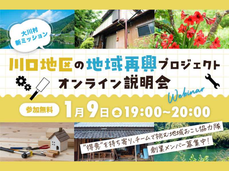 大川村の川口地域はかつて賑わいのあった地区ですが、現在は人口減少と空き家の増加が進んでいます。 この地域に新たな人の流れと生業を生み出すため、大川村では新たな地域おこし協力隊ミッション「川口地区の地域再興プロジェクト」を募集します。 空き家を活用したゲストハウス運営を中心としながら、地域課題(観光開発・農業サポート・住民の困りごと支援)にも取り組む、マルチワーカー型地域おこし協力隊ミッションです。 協力隊卒業後も地域に定着し、安定した収入を得ることを目的として、複数の仕事を組み合わせた生業づくりに取り組んでもらいます。 本ミッションは、3名の創業メンバー活動します。すでに1名が決定しており、2026年1月に着任する先行メンバーと共に取り組む仲間を募集中です。 詳しく話を聞いてみたいという方向けにオンライン説明会を開催しますので、ぜひお気軽にご参加ください。