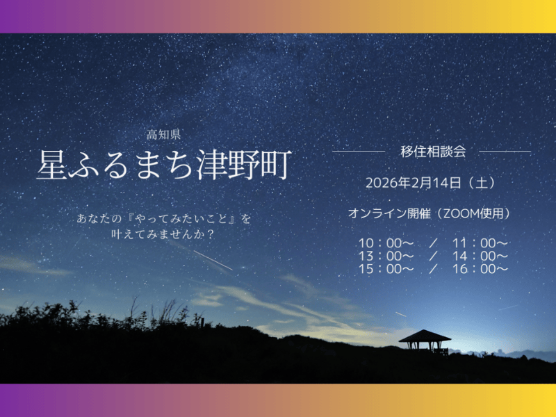 地域おこし協力隊のことはもちろん、暮らしのこと、仕事のこと、住まいのこと、支援制度のことなど、津野町担当者から直接聞ける絶好のチャンスです!!移住について気になること、小さなことでもかまいません。お気軽にご相談ください。 【開催日時】 2026年2月14日(土)オンライン開催(Zoom使用) 10:00~/11:00~/13:00~/14:00~/15:00~/16:00~ 計6枠(各50分程度)/事前申込必要/参加無料 【あなたの経験を協力隊で活かしてみませんか?】 こんな方にオススメ! ✅一次産業に興味がある ✅アウトドアレジャーがとても好き ✅過疎地域の活性化に意欲的に挑戦したい ✅地場のもので商品開発に挑戦したい ✅将来は起業を考えている 【暮らしのこと、仕事のこと、住まいのこと】 そのほか気になることは、当日オンライン相談会でお気軽にご質問ください♪ 津野町移住担当者と高知県移住コンシェルジュがあなたをお待ちしております!