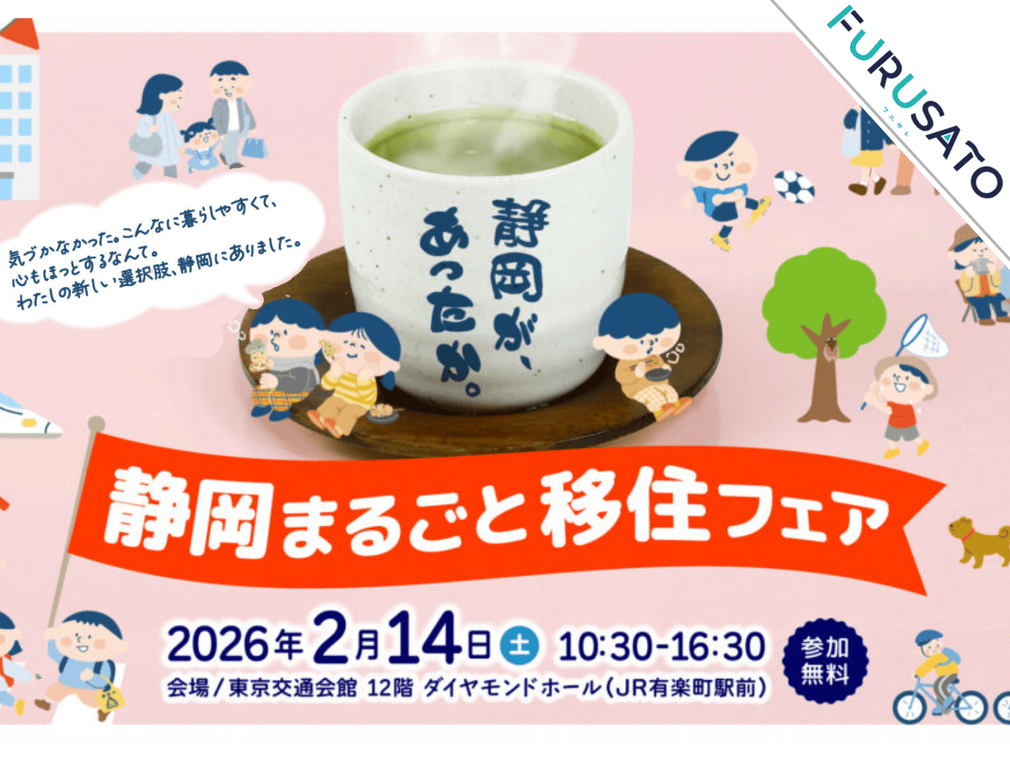 富士山、海、あったかい気候、そして人。 自然と都市がちょうどよく交わる静岡には、 “あなたらしい暮らし”を叶えるヒントがたくさんあります。 「移住ってまだピンときていない」「まずは話を聞いてみたい」 「自然豊かな環境で、のびのび子育てしてみたい」 気軽に、ふらっと、静岡の暮らしをのぞいてみませんか? ーーーーー🗻 静岡まるごと移住フェア ーーーーー ■開催日: 2026年2月14日(土) 10:30~16:30 ■会場: 東京交通会館12階 ダイヤモンドホール (JR有楽町駅前) ■参加費:無料! ▶詳細はこちらから https://marugotoiju.pref.shizuoka.jp/