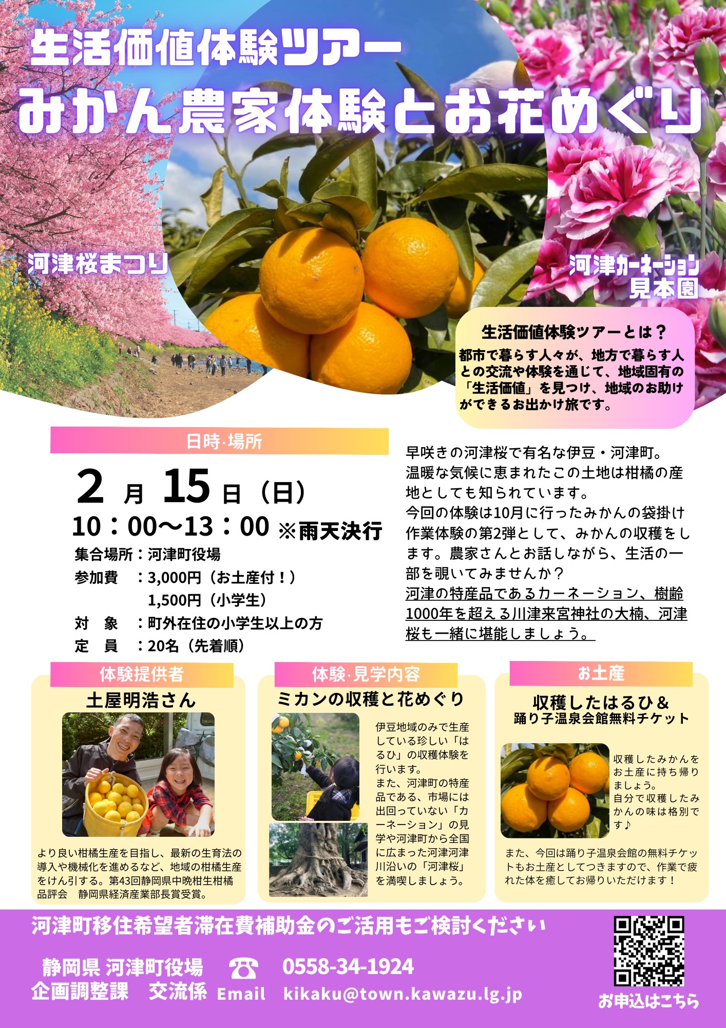 申込フォーム「生活価値体験ツアー みかん農家体験とお花めぐり」からお申込みください。