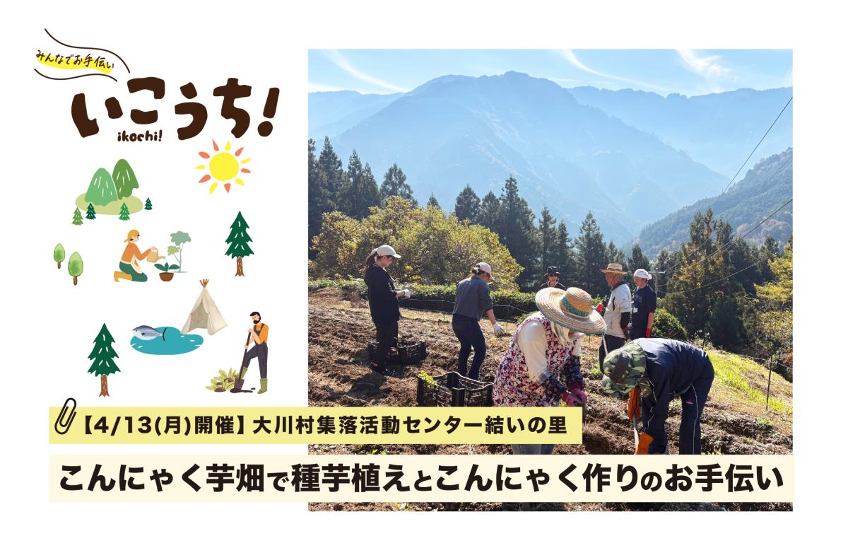 プログラムの内容 開催日時: 2026年4月13日(月)9:30〜16:30 開催エリア:大川村 主 催 者 : 大川村集落活動センター結いの里 対 象: 農業に愛着のある方 耕作放棄地の再生を通じた地域活性化を一緒に志してくれる方 お子様の参加も歓迎します 応募締切: 2026年4月6日(月)17:00 使われなくなった農地を再生し、大川村の名物こんにゃく芋を栽培しています。 今回は、こんにゃく芋畑の種芋植えとこんにゃく作りのお手伝いをしていただきます。