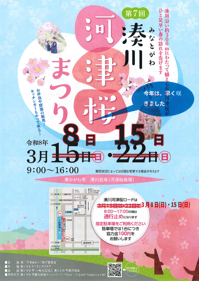 湊川河津桜ロードは、3月8日(日)、15日(日)の8時から17時の間は通行止めとなります。指定駐車場をご利用ください。また、駐車場では1台につき協力金100円をお願いします。