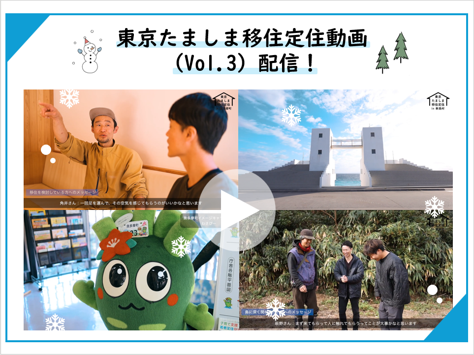 多摩・島しょ地域の暮らしの魅力を伝える「東京たましま移住定住動画(Vol.3)」を配信しました! 豊かな自然に囲まれたまち、温かな人とのつながり。 地域の風景や移住者の声を通して、ぜひ多摩・島しょ地域の「暮らし」のイメージを感じてください♪
